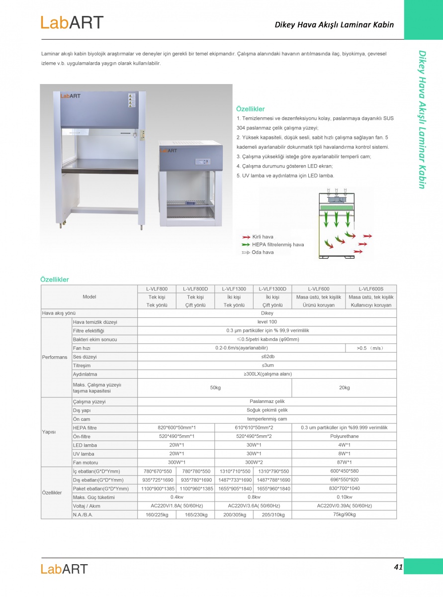 | Filtre efektifliği | 0.3 µm partiküller için % 99,9 verimlilik | ||||||