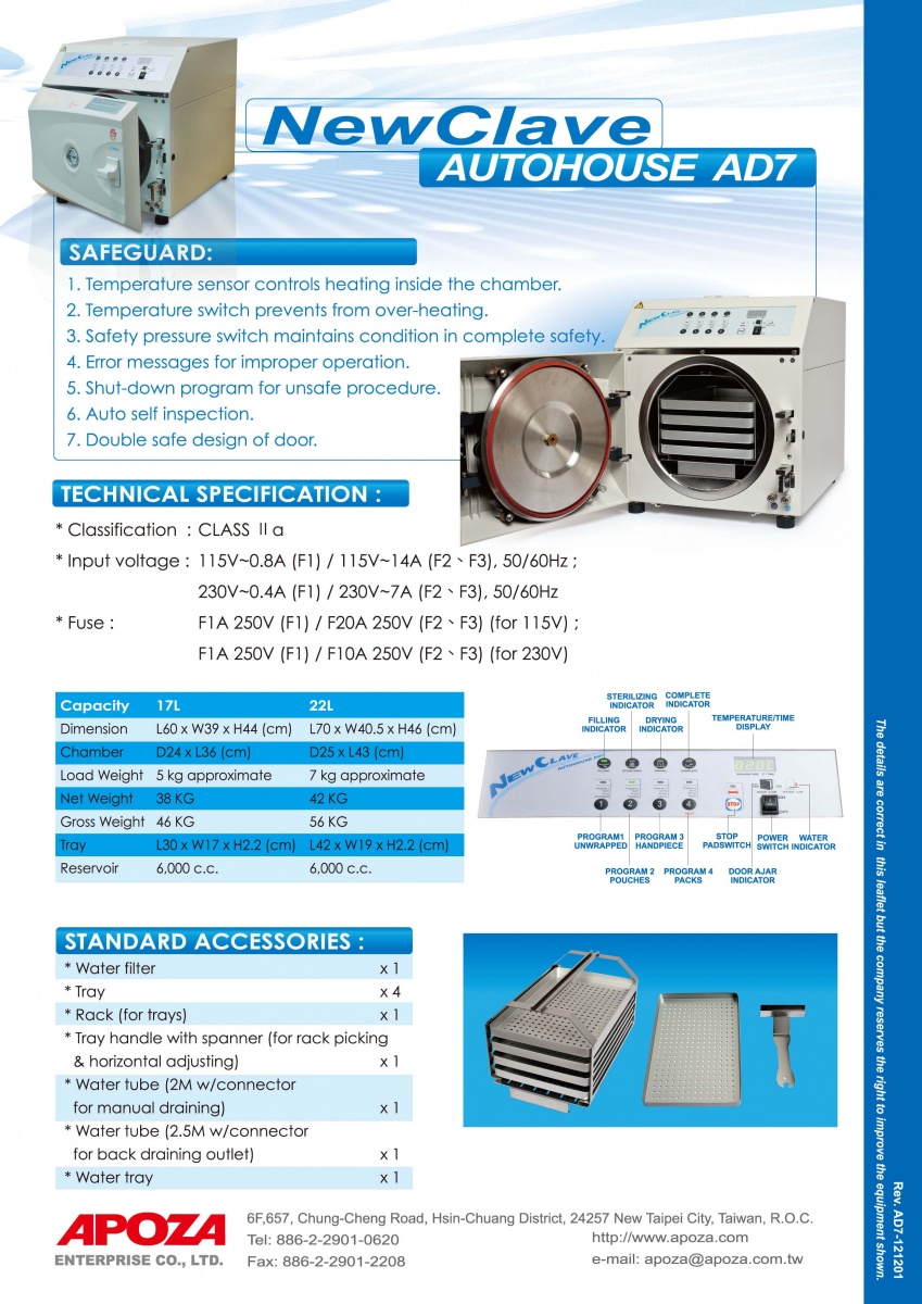 Operating Pressure : 15 PSI / 121°C 30 PSI / l 34°C |